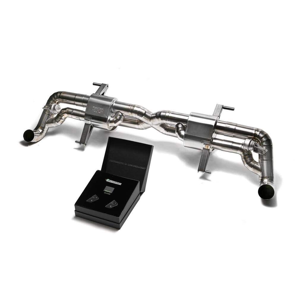 X-pipe mufflers + Valvetronic tail pipe section +Wireless remote control kits for Audi R8 MKI Facelift V10 5.2 FSI Coupe/Spider (2013-2015)FitmentR8 V10 MKI Facelift Coupe / Spyder2013-2015V10 5.2 FSI Features Main pipe diameter: 2 x 3″ Tips: Dual 5″ Exclusive System Features a Catalytic Converter & OPF Related Fault Code Clearing Mechanism – Reduces Chances of Check Engine Light Direct Bolt-On Plug-n-Play Module Reduces Installation Time by 30% Compared to Traditional Cable Wires App Controlled Valve System via OBDII Port Note Utilize VIN to Verify the Model Year Prior to Installation. Cat-Back system Fit to Both Left-Hand Drive/Right-Hand Drive Cars Armytrix OBDII Control Module Required, and the OEM valvetronic Control Can be Integrated