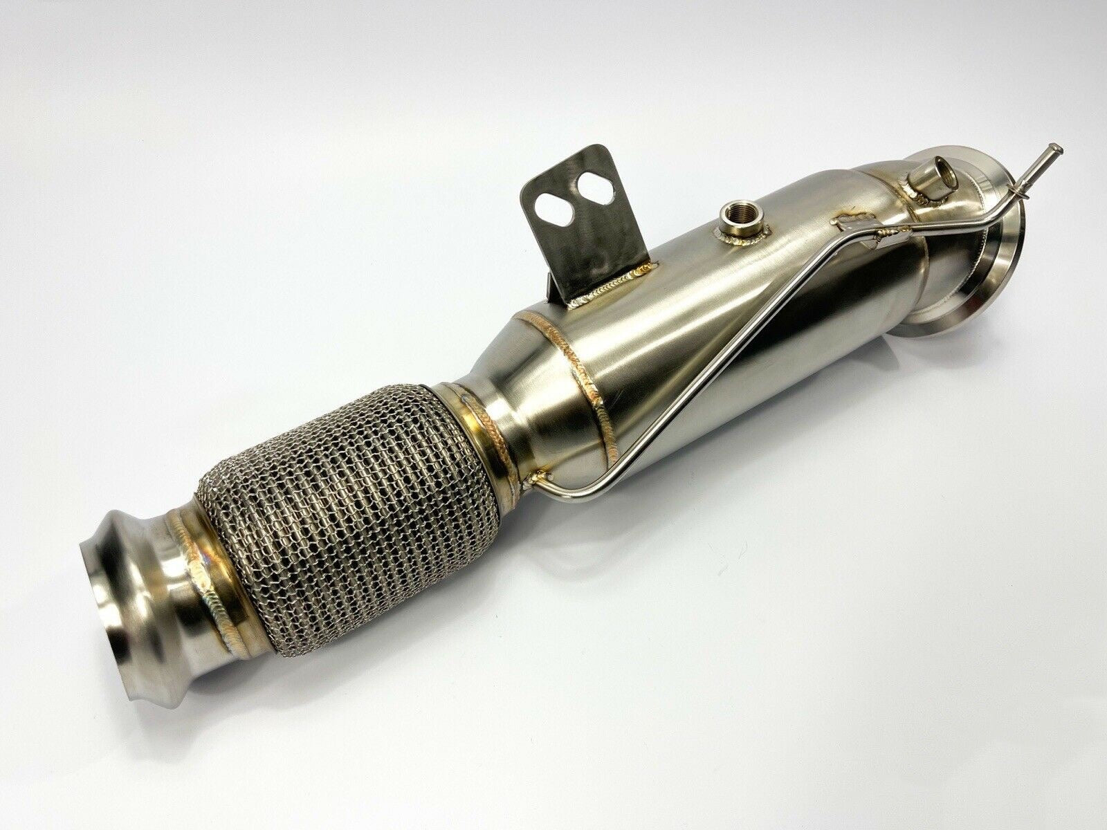 MTC Motorsport BMW M340i 440i 540i 640i 740i and 840i 4.5” stainless steel decat downpipe for B58 OPF engines only. The Z4 M40i downpipe is machined from SS304 aircraft-grade stainless steel and are tig welded in house The B58 downpipe is made of 3.5″ stainless pipe straight out of the turbo providing a sharper throttle response due to faster spool of the turbo This downpipe will provide noticeable power gains and a much more aggressive exhaust note which sounds truly amazing It produces lower temperatures and less exhaust backpressure due to the relief of the turbocharger. Also, the cylinder charge is increased There is also a substantial weight saving in comparison to the factory catalytic converter. The decat is mandrel-bent for better gas flow and maximum internal size to ensure ultimate performance without the loss of mid-range torque. This downpipe will fit the following models with OPF/PPF only: BMW G20/21 M340i 3.0L 285KW/374PS 2019 OPF Model BMW G22 440i 3.0L 285KW/387PS 2019 OPF Model BMW G30/31 540i 3.0L 250KW/340PS 2018 OPF Model BMW G32 640i 3.0L 250KW/340PS 2018 OPF Model BMW G11/12 740i 3.0L 240KW/326PS 2019 OPF Model BMW G14/15/16 840i 3.0L 250KW/340PS 2019 OPF Model BMW Z4 G29 M40i 3.0L 250KW/340PS 2019 OPF Model Toyota Supra MK5 A90 GR 3.0L 250KW/340PS 2019 OPF Model Original BMW part number 18329897313. We have tested this product and found increases of around 20-25bhp. Professional installation is recommended as some exhausts sit slightly different from others and can be tight although the feedback we have received from this product is that it is very easy to fit. Please note, you will need to swap the gasket in the turbo end of the downpipe over or you will get a smell of fuel in the cabin. We also recommend purchasing a Lambda Sensor Spacer(s) to prevent the engine light coming on in most cases. If you search our other items you will find these. If you would like this product fitted to your car in our Lancashire workshop please give us a call and we can arrange this and also do an exchange with your original cat which usually covers the cost of the downpipe and fitting from us.