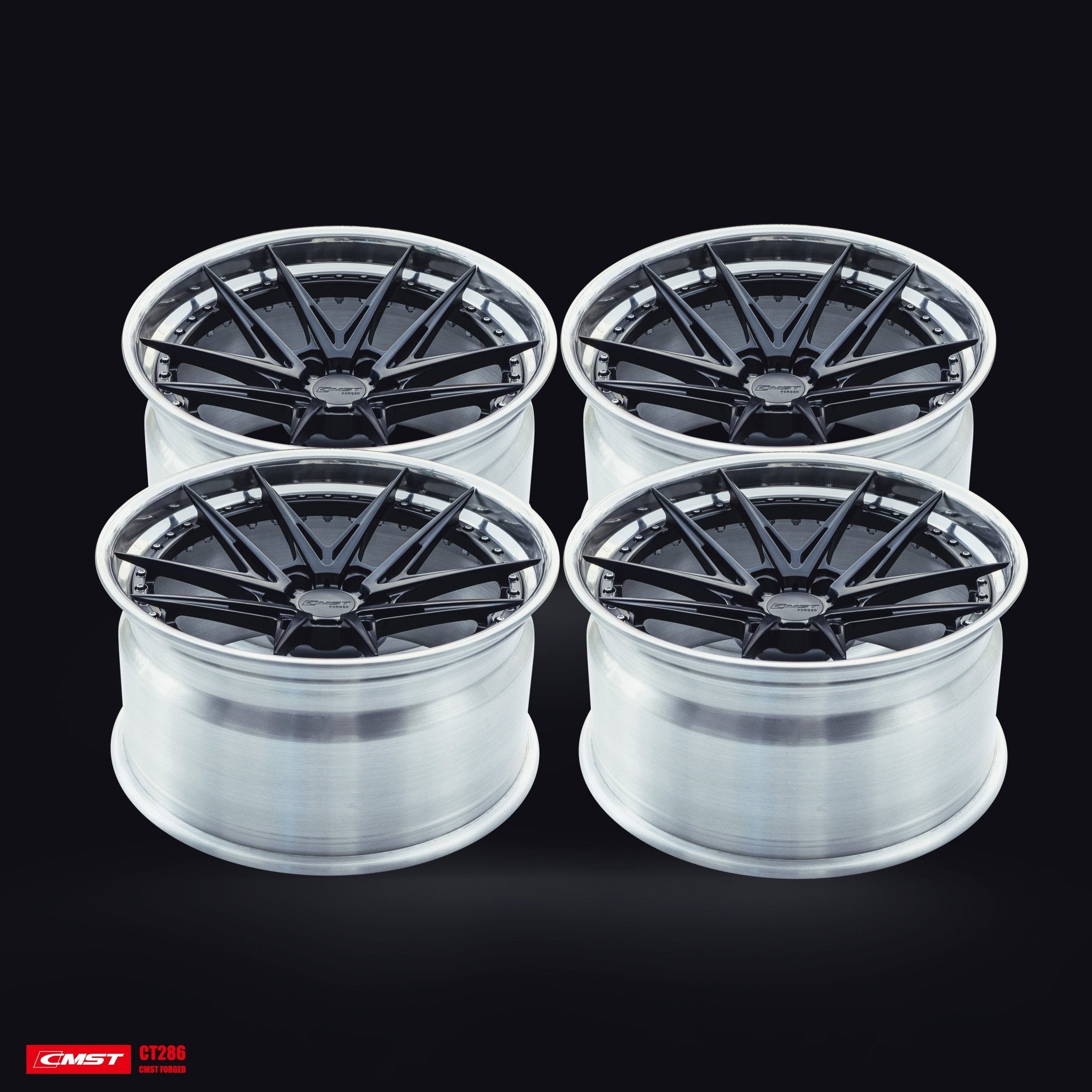Thank you for your interest in our custom CMST Forged wheels. Each set is unique and made to order. You can design your 1 of 1 forged wheel that best fits your taste. Exclusivity is guaranteed. The designing and production of wheels are carried out in accordance with the most stringent international quality standards. The wheels are made exclusively from high quality aircraft aluminum of 6061-T06 grade. At the moment, lead time is 4-5 weeks. We offer custom 1 piece and 2 piece forged wheels. Choose from our many colors options, brushed, fine polish, and chrome finish. Since January 2020, carbon fiber and forge carbon fiber finish is available as an option! The price listed on the product page is based on the size and structure. Additional charges for upgraded finishes. Monoblock or 2 piece (price as option selected) Diameter (price as option selected) Width (priced as option selected +$30 every half inch over 10 inches wide) Carbon Fiber Lip (Woven Carbon $220 / Forged Carbon $340) Carbon Fiber Inner Lip (Woven Carbon $220 / Forged Carbon $340) Brushed Finish ($40) Fine Polish ($50) Chrome ($100) Select from over 300 styles. To place an order, please first add the items to cart and check out, and then contact us and let us know your detailed preferences. Be sure to include your Name Order Number Style Bolt Pattern (center lock and center lock cover now available!) Size Width Offset Spokes Color Dish Color/Carbon Finish 1 Piece / 2 Piece