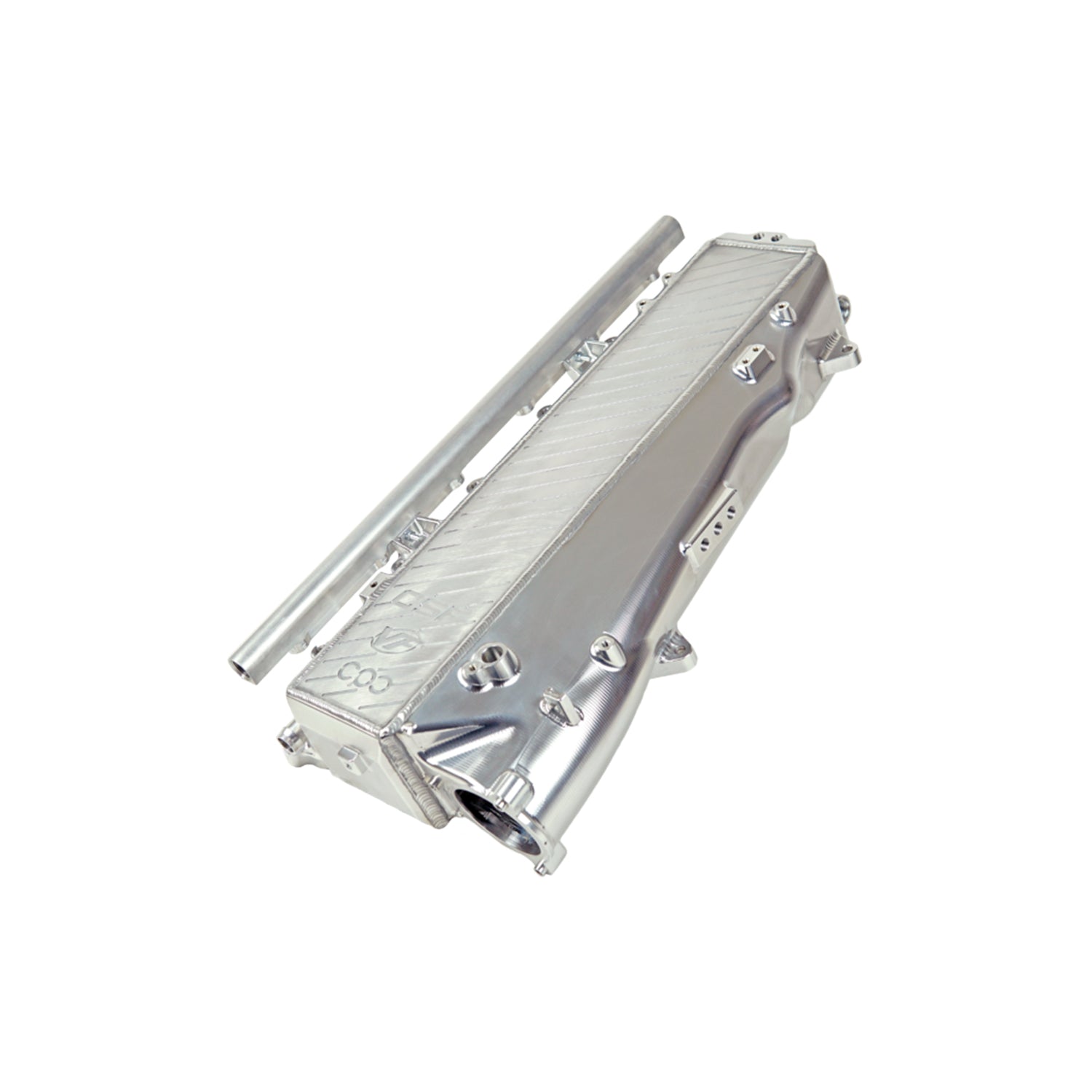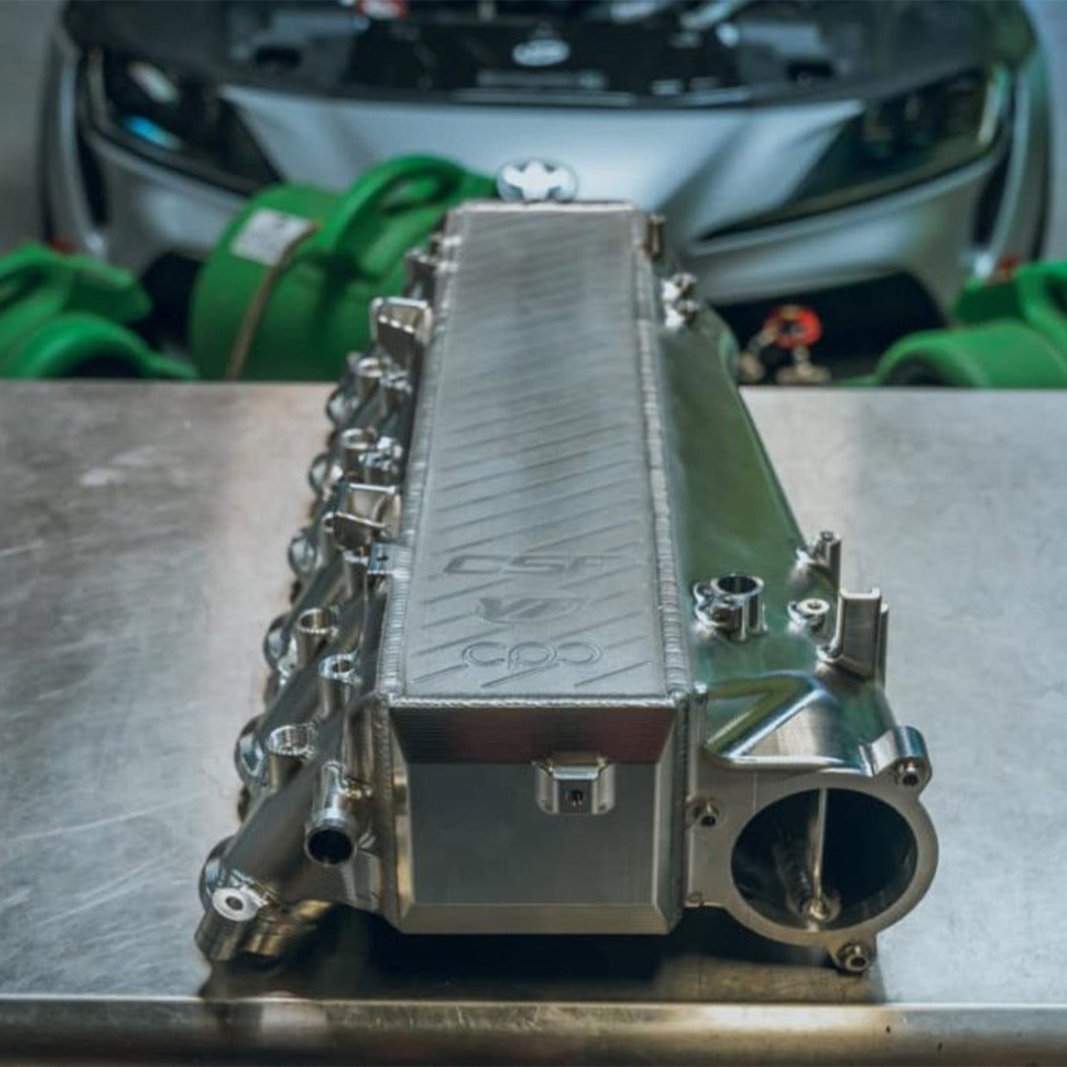 With over 1500 hours of design, development, machining, and testing, CSF, along with partners VF Engineering (USA) and Custom Plenum Creations (Australia), has now brought a state-of-the-art CNC machined, high-performance Charge-Air Cooler Manifold to the B58 platform (Mk5 Supra and BMW models). This product solves what has been commonly known as a weak link of an otherwise impressive new engine platform. With the larger and more efficient water-to-air intercooler performance, lower pressure drop across the system, included fuel rail, kit for top feed port injection, and several other industry-leading features, the CSF Super Manifold will allow B58 owners to maximize the performance of their vehicles and push the limits further than what has been previously possible with this new platform. The newer 2nd gen B58 engine, found in the Mk5 Supra, has already been proven to be an incredible platform for performance enthusiasts – taking the performance and motorsports industry by storm in just a couple of years since its release. Customers are now pushing through the 1000whp mark on their B58-powered vehicles with the CSF manifold. The OEM water-cooled charge air cooler intake manifold for the B58 engine is adequate in cars with little or no modifications but starts to really show its weakness in cars with bolt-on mods, turbo upgrades, increased fueling (such as port injection), and performance tuning. The OEM intercooler system has also been known to suffer from heat soak in demanding racing conditions such as time attack, endurance racing, drag racing, drifting, and even spirited street driving. This can cause the car to pull timing out of the engine due to high intake air temperatures (IATs), and can cause “limp mode” once temperatures reach a certain threshold, as the vehicle’s ECU attempts to protect the engine. The CSF #8200 comes in a raw billet aluminum finish. Also available in Thermal Black Heat Dispersion (CSF #8200B) & custom colours/finishes (CSF #8200C). Features Utilises a High Performance, Motorsports-Grade Bar/Plate Air-to-Water Intercooler Core Double the Capacity of the OEM Core (12 Rows of Water Cooling vs. OEM 6 Rows) Significantly Lower Pressure Drop Across the Core Compared to OEM Designed in SolidWorks Using Computational Fluid Dynamics (CFD) Integrated Air Divider in Inlet Tank Evenly Distributes Airflow Throughout the Core Easy Access to Spin-Off Oil Filter for Quick Oil Changes – No Need to Uninstall Manifold Every Oil Change Counter Balanced Design for Optimized Airflow Integrated Sensor Pad with Three 1/8″ NPT Ports to Measure Additional Parameters Included Optional Fuel Rail for Top Feed Port Injection Individual Port Injection Bungs on Each Cylinder Runner (Comes Pre-Plugged) Individual 1/8″ NPT Ports on the Top of Each Cylinder Runner for Nitrous or Meth Injection Allows for Even Spray Distribution and Control for Maximum Performance and Engine Protection Individual 1/8″ NPT Breather Ports for Both Inlet/Outlet Water Connections on Back of Manifold for Easy Air-Bleeding of the System Plug-and-Play design, Requiring No Modifications to Install Includes Hardware and Installation Kit with Picture Diagrams Containing 28 Different Parts for Easy Installation Can be Used With OEM or Aftermarket Engine Covers (with OEM Connections) Comes Finished in Raw Billet Aluminum (available in custom finishes) – Made by World-Leading Automotive Machinist Custom Plenum Creations in Australia CSF pressure tests each #8200 / #8200C manifold at 60-70 PSI for a period of 2-3 minutes during the Quality Control and Inspection process. The CSF manifold is not designed to operate above 60 PSI. Users who choose to operate their vehicle with the CSF manifold over 60 PSI do so at their own risk. Operation at these pressure levels will void the CSF Limited Warranty. Compatible Vehicles 2020-2023 BMW G30 540i – Turbocharged 3.0L L6 2020-2023 BMW G30 540i xDrive – Turbocharged 3.0L L6 2018-2022 BMW G11 740i – Turbocharged 3.0L L6 2018-2022 BMW G11 740i xDrive – Turbocharged 3.0L L6 2020-2022 BMW G11 745e xDrive – Turbocharged 3.0L L6 2020-2024 BMW G1X 840i – Turbocharged 3.0L L6 2020-2024 BMW G1X 840i Gran Coupe – Turbocharged 3.0L L6 2020-2024 BMW G1X 840i xDrive – Turbocharged 3.0L L6 2020-2024 BMW G1X 840i xDrive Gran Coupe – Turbocharged 3.0L L6 2023+ BMW G42 M240i – Turbocharged 3.0L L6 2022+ BMW G42 M240i xDrive – Turbocharged 3.0L L6 2020-2024 BMW G2X M340i – Turbocharged 3.0L L6 2020-2024 BMW G2X M340i xDrive – Turbocharged 3.0L L6 2021-2024 BMW G2X M440i – Turbocharged 3.0L L6 2024+ BMW G2X M440i Gran Coupe – Turbocharged 3.0L L6 2021-2024 BMW G2X M440i xDrive – Turbocharged 3.0L L6 2022+ BMW G2X M440i xDrive Gran Coupe – Turbocharged 3.0L L6 2020-2024 BMW G01 X3 M40i – Turbocharged 3.0L L6 2020-2024 BMW G02 X4 M40i – Turbocharged 3.0L L6 2020-2024 BMW G05 X5 sDrive40i – Turbocharged 3.0L L6 2019-2024 BMW G05 X5 xDrive40i – Turbocharged 3.0L L6 2021-2023 BMW G05 X5 xDrive45e – Turbocharged 3.0L L6 2024+ BMW G05 X5 xDrive50e – Turbocharged 3.0L L6 2020-2021 BMW G06 X6 sDrive40i – Turbocharged 3.0L L6 2020-2024 BMW G06 X6 xDrive40i – Turbocharged 3.0L L6 2020-2024 BMW G07 X7 xDrive40i – Turbocharged 3.0L L6 2020-2024 BMW G29 Z4 M40i – Turbocharged 3.0L L6 2024+ Toyota GR Supra 45th Anniversary Edition – 3.0L L6 2023+ Toyota GR Supra A91-MT Edition – 3.0L L6 2023+ Toyota GR Supra Premium – 3.0L L6 2024+ Toyota GR Supra Premium 45th Anniversary Edition – 3.0L L6 2020-2022 Toyota GR Supra – Turbocharged 3.0L L6 2020-2024 Toyota GR Supra – 3.0L L6 OEM Part Numbers BMW: 11 61 8 647 977 *M240i Yes BMW: 11-61-8-647-977 *M240i Yes BMW: 11618647977 *M240i Yes Toyota: 17101 WAA01 Toyota: 17101-WAA01 Toyota: 17101WAA01
