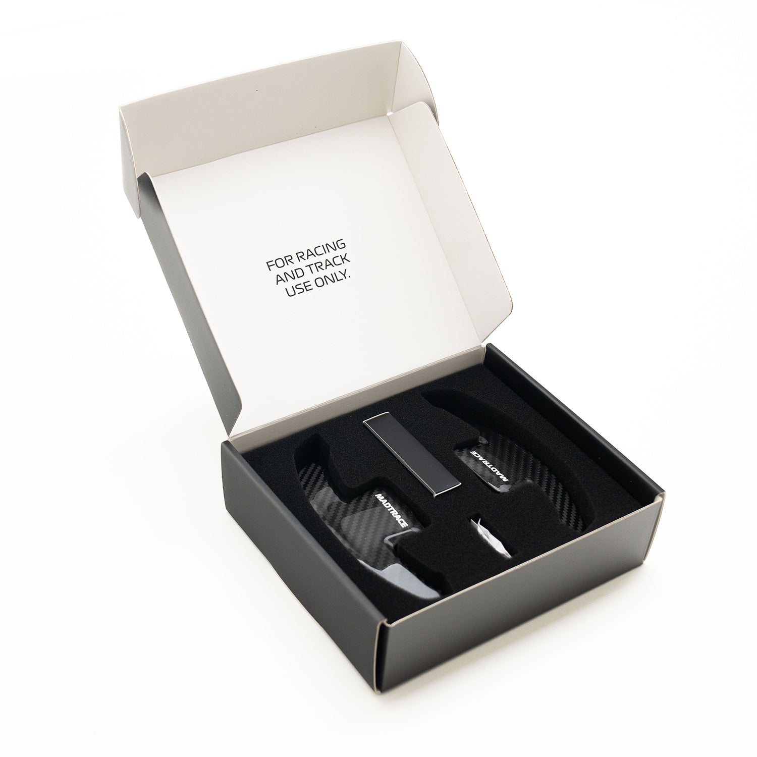 Experience unmatched control and precision with the JQ Werks Madtrace® Clubsport Adjustable Magnetic Paddle Shifter System, engineered for ultimate driver engagement in the BMW G90 & G99 M5. Featuring full gloss carbon fibre paddles and a neodymium magnetic mechanism, this system delivers a tactile, high-quality feel that redefines the shifting experience. Developed for performance-focused BMW drivers, the Madtrace® magnetic paddle system provides a crisp, satisfying “click” with every shift — offering instant feedback and a faster, more mechanical connection to the car. The magnetic return ensures a strong, consistent action that guarantees precise gear selection at any steering angle, even during spirited driving or track use. Each paddle shifter offers full angle and distance adjustability, allowing you to fine-tune the paddle position to your exact driving preference. Whether you prefer short, rapid inputs or a more extended reach, the Madtrace® system delivers race-grade ergonomics tailored to you. With its gloss carbon fibre construction and precision-engineered components, the Clubsport Adjustable kit provides a striking aesthetic upgrade to your M5’s interior while maintaining factory-level fitment. Installation is fully plug-and-play, requiring no modifications to the steering wheel or wiring harness. Key Features Fits: BMW G90/G99 M5 (2024+) Full gloss carbon fibre paddles Neodymium magnetic mechanism for crisp, tactile shifts Fully adjustable angle and distance for custom fitment Plug & Play installation with OEM steering wheel compatibility Satisfying click feedback for improved driver engagement Precision-tested design for reliable shifting under load Includes limited lifetime warranty (mechanisms only) For off-road/track use only Compatibility BMW G90 M5 BMW G99 M5 Touring What’s in the Box? JQ Werks Madtrace® Clubsport Adjustable Magnetic Paddle Shifters (Pair) Mounting hardware and adjustment tools Installation instructions