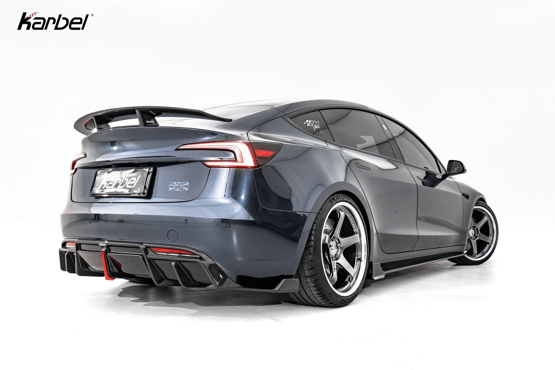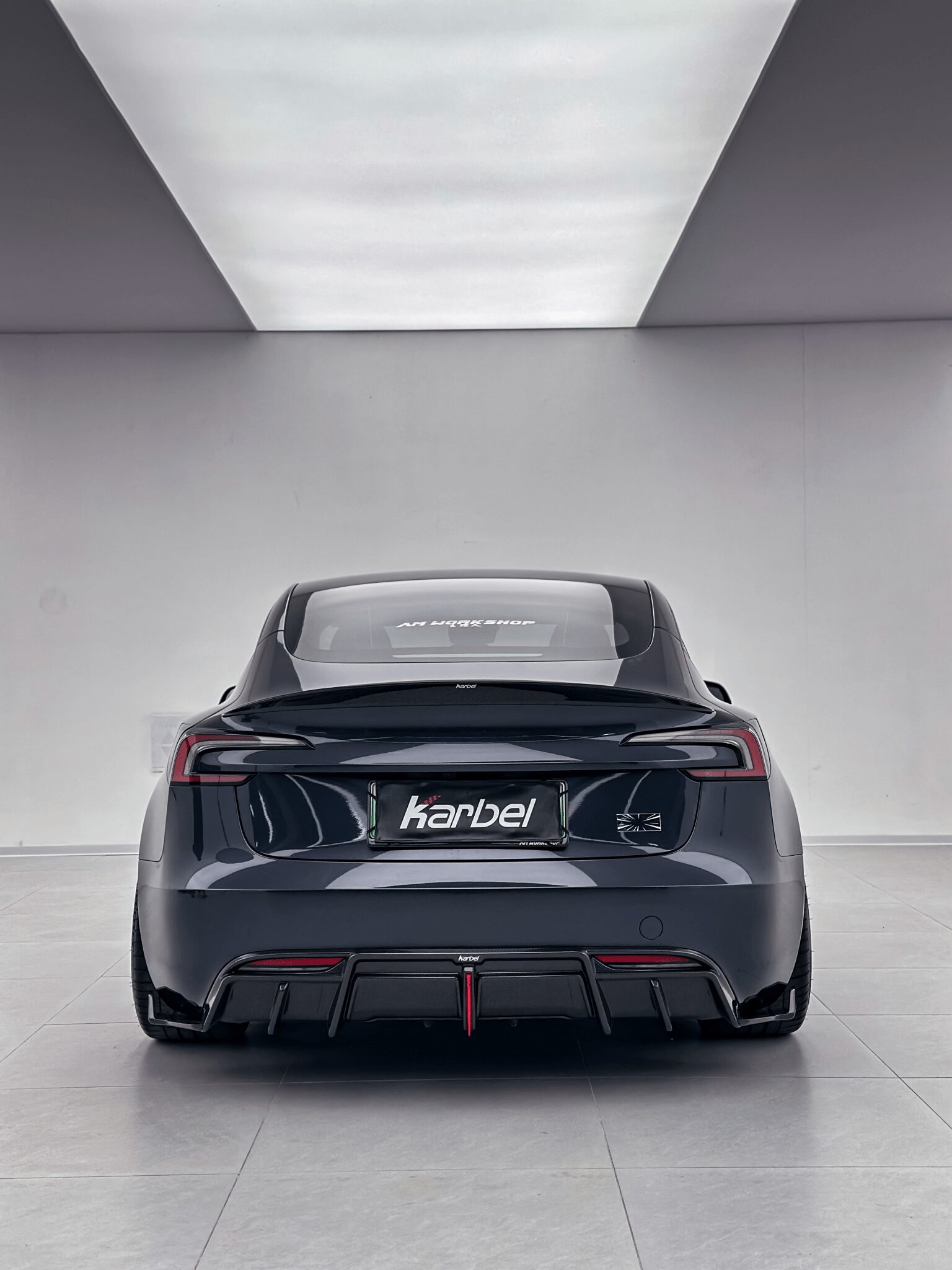 KARBEL – TESLA MODEL 3P PERFORMANCE HIGHLAND DRY CARBON FIBER LED REAR DIFFUSER MANUFACTURER: KARBEL MATERIAL : DRY CARBON FIBER FITS: TESLA MODEL 3P PERFORMANCE HIGHLAND 2024+
