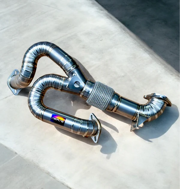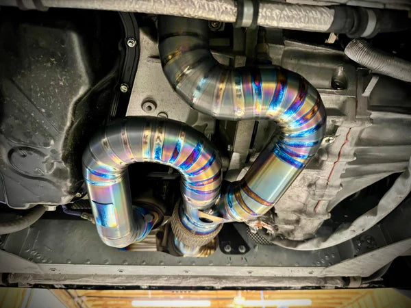 **Aerie Performance Titanium Y-Pipes for Emira V6** Upgrade your Emira V6 effortlessly with our Aerie Performance Titanium Y-Pipes—no modifications required, just a straightforward swap! Distinct from OEM y-pipe 2-1 collector merge flattened, our titanium Y-pipe features a unique 2-1 collector to optimizes exhaust gas flow into the catalytic converter. This design reduces back pressure, enhancing power performance. Plus, it’s lightweight at just 2.1 kg compared to the OEM’s 4.5 kg. Elevate your driving experience with Aerie Performance!