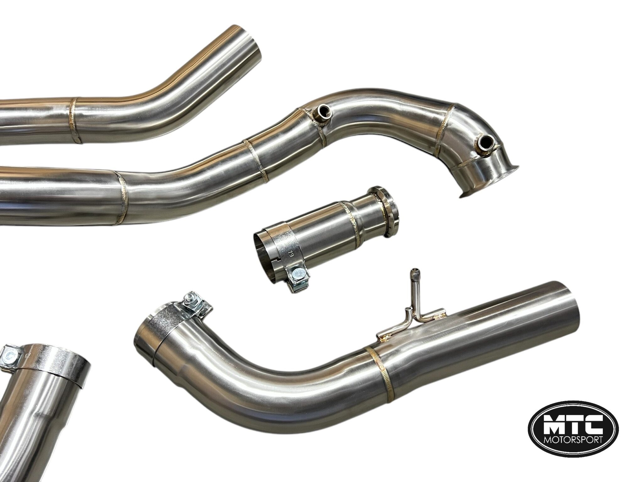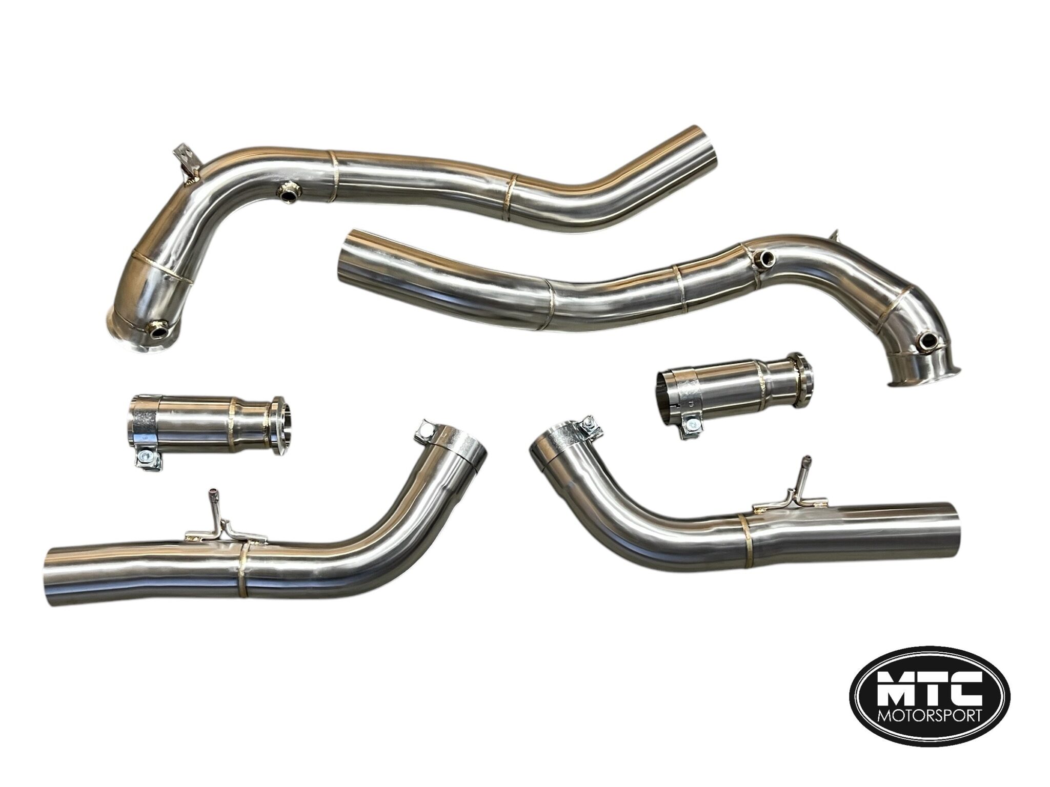 MTC Motorsport Mercedes G63 AMG Stainless Steel Decat Downpipes The G63 AMG downpipes are machined from T-304 high-grade stainless steel are are tig welded in house The downpipes are made of 76mm stainless pipe straight out of the turbo providing a sharper throttle response due to faster spool of the turbo These downpipes will provide noticeable power gains and a much more aggressive exhaust note which sounds truly amazing. Produces lower temperatures and less exhaust backpressure due to the relief of the turbocharger. The cylinder charge is increased which generates maximum performance. There is also a substantial weight saving in comparison to the factory catalytic converter The decats are mandrel-bent for better gas flow and maximum internal size to ensure ultimate performance without the loss of mid-range torque. These will fit the following models perfectly: G63 AMG 2019- We have tested this product and found increases of around 35bhp without a map and 120bhp with a stage 2 map. Please contact the tuner or fitter before you commit to buy these as they have OPF filters in the downpipes and these will need coding out so you don’t get an engine light. The standard V band clamp works perfectly onto the turbo and we supply stainless clamps to join the two together in the middle as well. Professional installation is recommended as some exhausts sit slightly different from others and all the AMG cars are a tricky fit. This product comes with a lifetime warranty.
