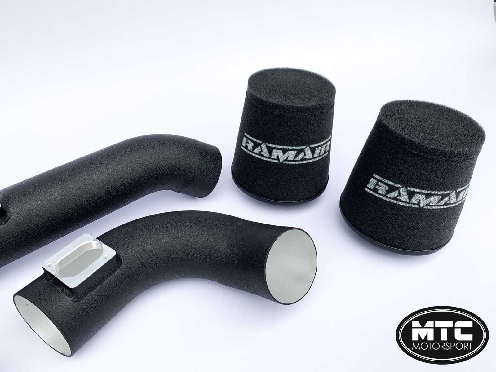 MTC Motorsport BMW M3 M4 Intakes and Filters These intakes have been designed to fit on the F chassis BMW M2 competition, M3 and M4 and maximise the airflow into the turbos. These intakes are mandrel-bent for better airflow and maximum internal size to ensure ultimate performance without the loss of mid-range torque. These are premium quality compared to others as these are not welded from several pieces. They provide a sharper throttle response so your car will feel more free and responsive with these installed. They also sound a lot better than the standard air box set up. The pipes will come powder coated in black with a crinkle finish. Included in the kit: x2 3” Aluminium Intake Pipes with Machined MAF Housings x1 Silicone Joiner x4 Jubilee Clips x2 RamAir 76mm Filters These intakes will fit the following models: BMW M2 Competition BMW M3 F80 BMW M4 F82 All GTS and Competition models with S55 engine Professional installation is recommended as these can sometimes be tricky to install.