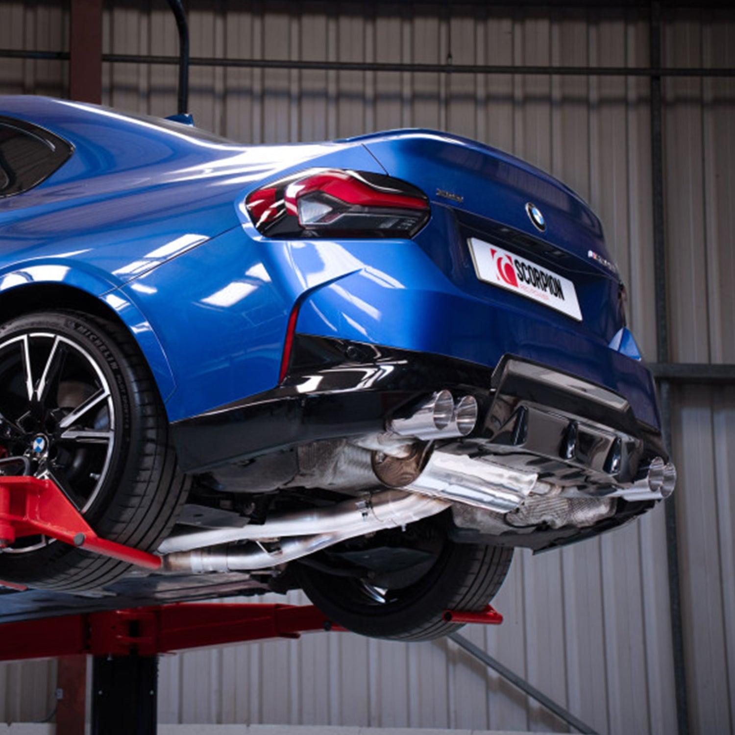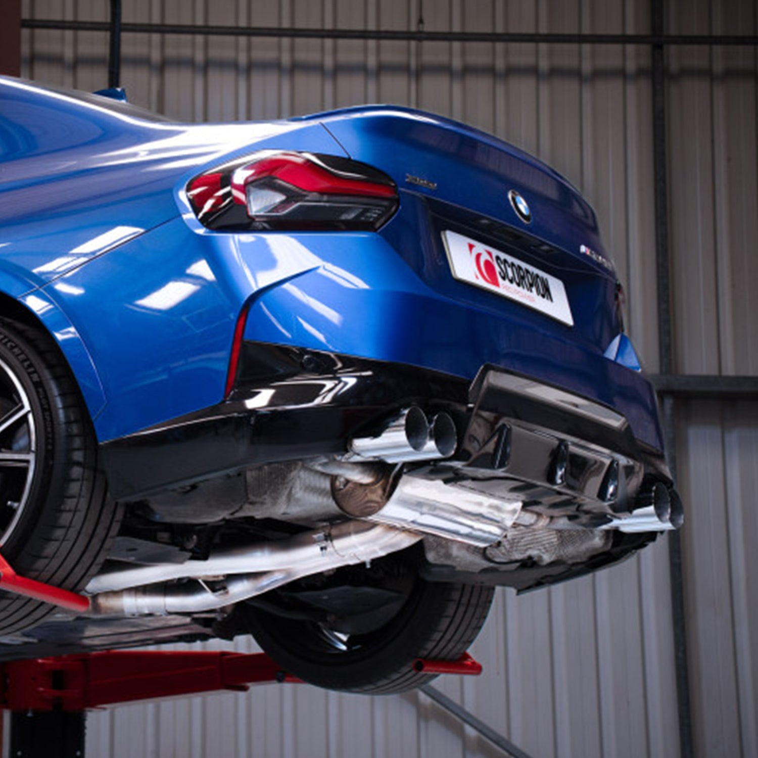 Scorpion Exhausts developed this awesome, great-value stainless steel exhaust system for the G42 M240i. The BMW M240i system runs from the particulate filters all the way back to the tips. The Scorpion system adds a much louder and fruitier exhaust note and offers up to 3.1kg weight saving (depending on variation) and a power boost over the factory rear silencer. The Scorpion rear silencer is smaller than OEM to increase airflow whilst still reducing drone. The Scorpion system retains the OEM valve functionality allowing you to switch between quiet and loud. This makes the system great to live with on a daily basis. As for installation, we offer professional fitting at our London workshop. Get in touch to arrange an appointment. Alternatively, the system can be installed by an experienced technician of your own choice. Scorpion offers a selection of tip options. You can retain your car’s OEM bumper trims for a ‘sleeper’ look or select one of the other quad-tip options which look far more aggressive! PRODUCT SPECIFICATION – Stainless steel construction- 70mm diameter- Valved system- OPF Back COMPATIBILITY – BMW G42 M240i (2022+) WHAT’S IN THE BOX? 890BM – L/H Rear Link Pipe891BM – R/H Rear Link Pipe892BM – Rear Silencer429FK – Fitting Kit+ Your chosen exhaust tips *DISCLAIMER: Scorpion Exhausts are generally designed for UK/EU-spec vehicles and aren’t guaranteed to fit vehicles in the US & global markets*