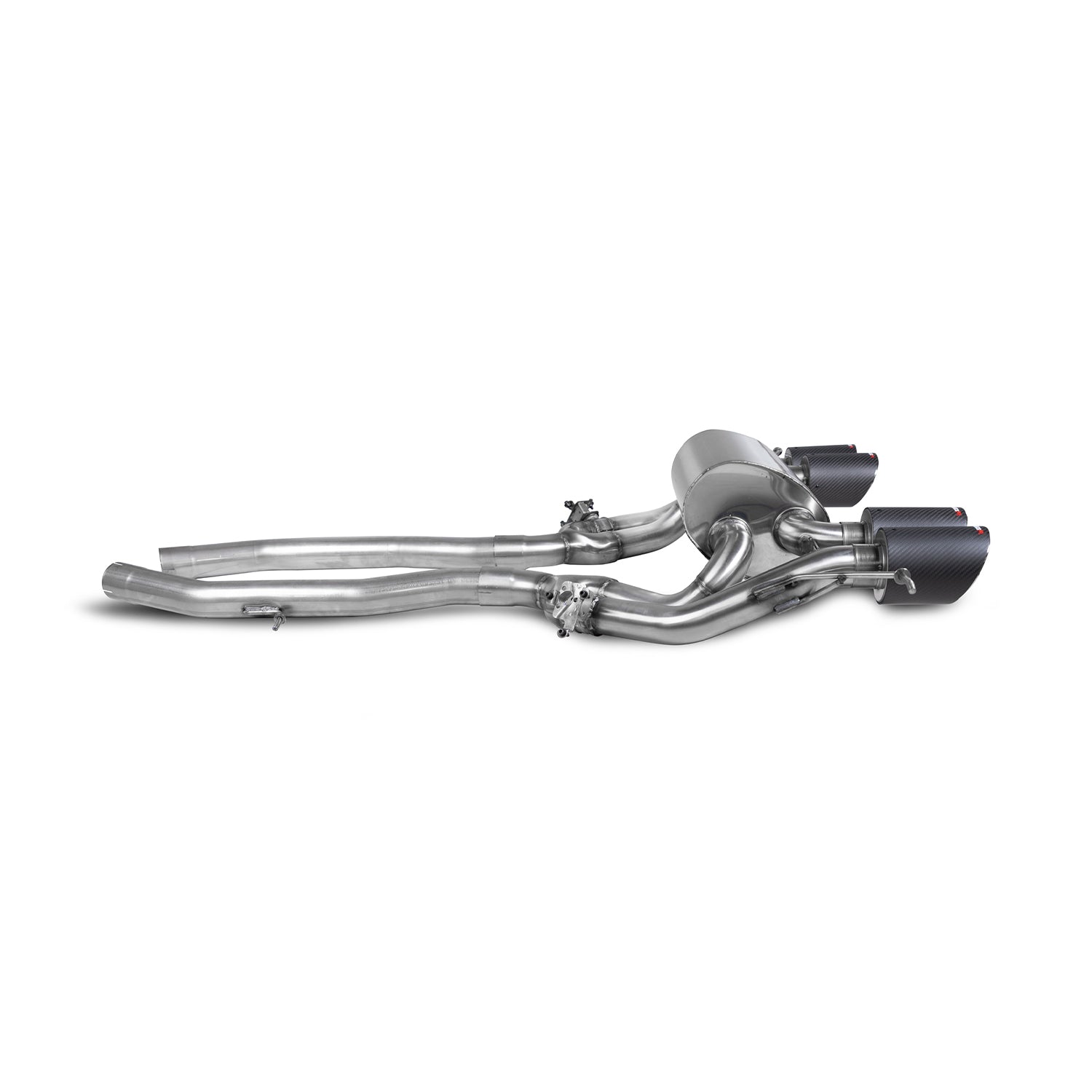 Scorpion Exhausts recently introduced this great-value and great-quality exhaust system for the BMW G80 G81 M3 & G82 G83 M4 that runs from the particulate filters all the way back to the tips. The Scorpion system adds a much louder and fruitier exhaust note and offers a 3.9kg weight saving over the factory rear silencer. The Scorpion rear silencer is smaller than OEM and when the valves are open, exhaust gases flow straight out without going through the backbox. If you’re looking for more, this system can be paired with Scorpion’s OPF-delete mid-section, turning this system into a full Cat Back! The Scorpion system retains the OEM valve functionality allowing you to switch between quiet and loud. This makes the system great to live with on a daily basis. As for installation, we offer professional fitting at our London workshop. Get in touch to arrange an appointment. Alternatively, Scorpion provides a comprehensive fitting guide. Click here to download. Scorpion offers an OEM-looking chrome tip option or a more aggressive OEM+ carbon fibre tip option. PRODUCT SPECIFICATION Stainless steel construction 70mm diameter 17.7kg weight (3.9kg lighter than factory) Valved system OPF Back COMPATIBILITY BMW G80 M3 Saloon (2021+) BMW G80 M3 Competition Saloon (2021+) BMW G81 M3 Touring (2023+) BMW G81 M3 Competition Touring (2023+) BMW G82 M4 Coupe (2021+) BMW G82 M4 Competition Coupe (2021+) BMW G83 M4 Convertible (2021+) BMW G83 M4 Competition Convertible (2021+)Fits both 2WD & xDrive models WHAT’S IN THE BOX? 826BM – RH Link Pipe 827BM – LH Link Pipe 828BM – RH Trim Pipe 829BM – LH Trim Pipe 830BM – Rear Silencer 377FK – Fitting Kit+ Your chosen exhaust tips *DISCLAIMER: Scorpion Exhausts are generally designed for UK/EU-spec vehicles and aren’t guaranteed to fit vehicles in the US & global markets*