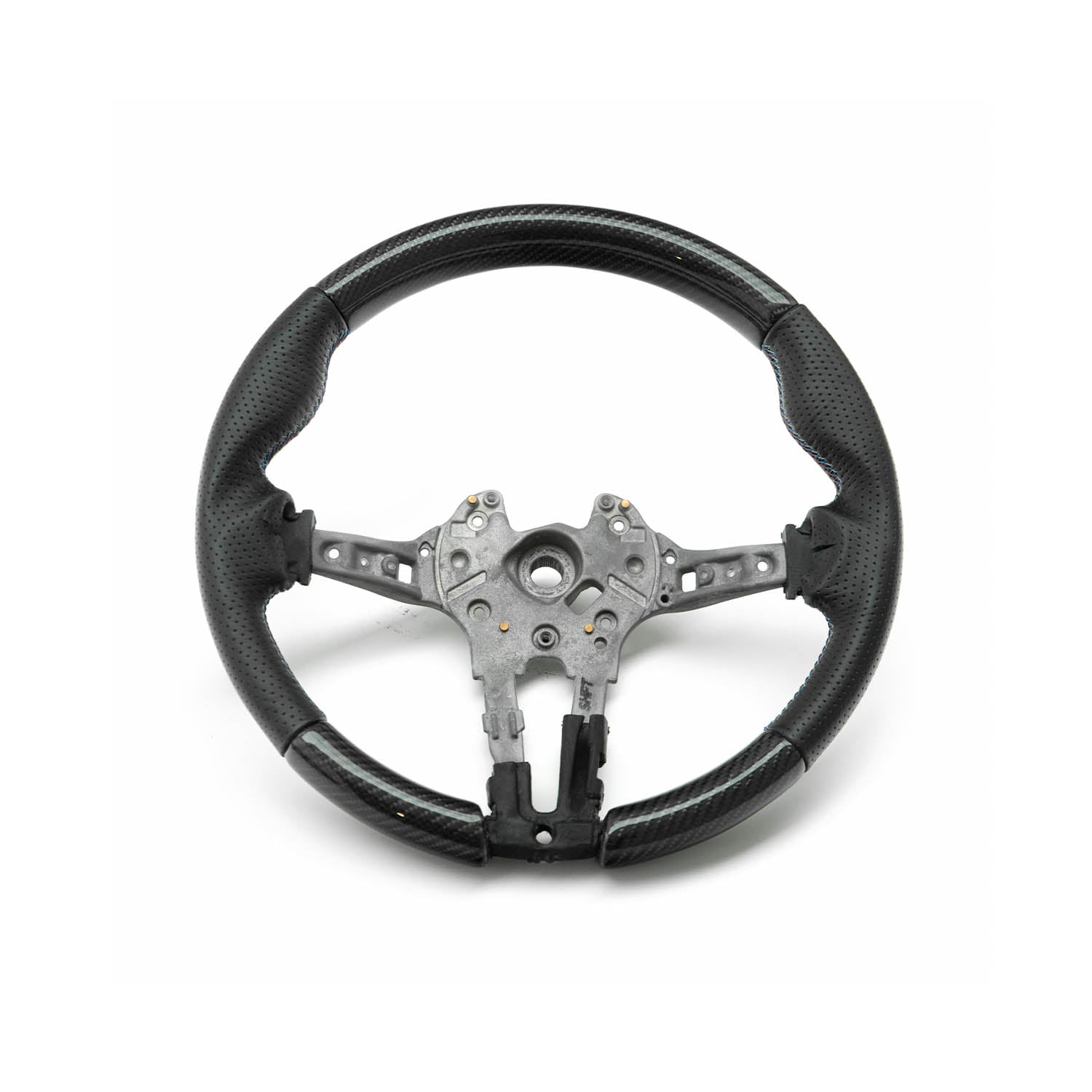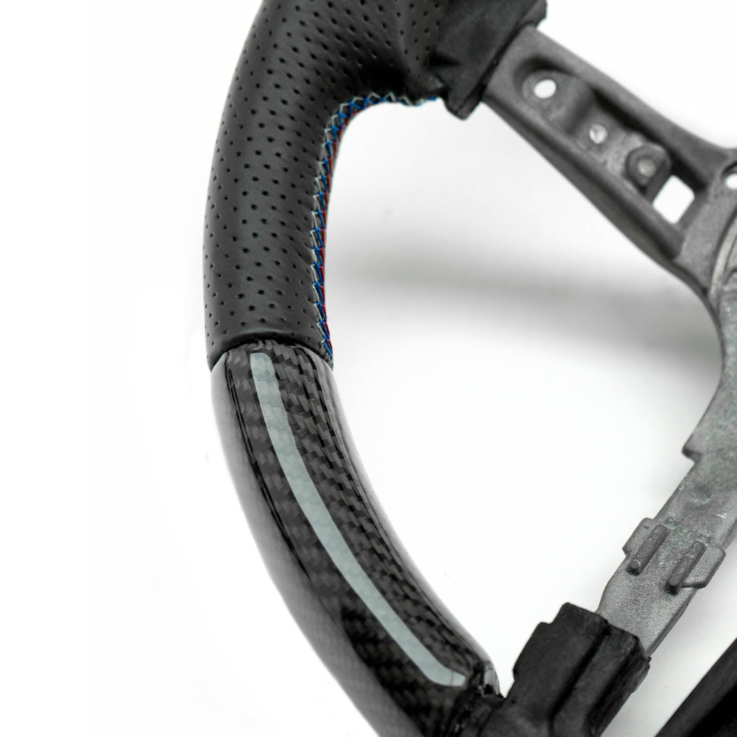 SHFT BMW F Series Round Steering Wheel In Gloss Carbon Fibre & Perforated Leather is the ultimate premium steering wheel upgrade for your F Series BMW. The combination of high gloss carbon fibre and perforated leather adds both a luxurious and sporty element to your vehicle’s interior. The perforated leather grips offer an enhanced grip for an improved driving experience. The high gloss carbon fibre features an OEM-style weave, allowing it to integrate seamlessly amongst any factory carbon fibre inside your vehicle. PRODUCT SPECIFICATION – Perforated grips for a better driving experience- Round design- Genuine carbon fibre top & bottom- High gloss carbon finish- BMW tri-colour stitching – You will need to fit all parts including the airbag, steering wheel controls and insert off your OEM wheel. Alternatively, get in touch for professional fitment at our London HQ.- All parts off of the OEM wheel fit onto this custom wheel *DISCLAIMER* NOT ALL FUNCTIONS ARE TRANSFERABLE (HEATED FUNCTION, LANE ASSIST etc.) COMPATIBILITY BMW 1 SERIES F20 & F21 (2015-2019) BMW 2 SERIES F22, F23 & F87 (2015-2019) BMW 3 SERIES F30, F31, F34 & F80 (2015-2019) BMW 4 SERIES F32, F33, F36, F82 & F83 (2015-2019) BMW X5 F85 BMW X6 F86 *All SHFT wheels come with a 2-year warranty. This does not cover general wear and tear.